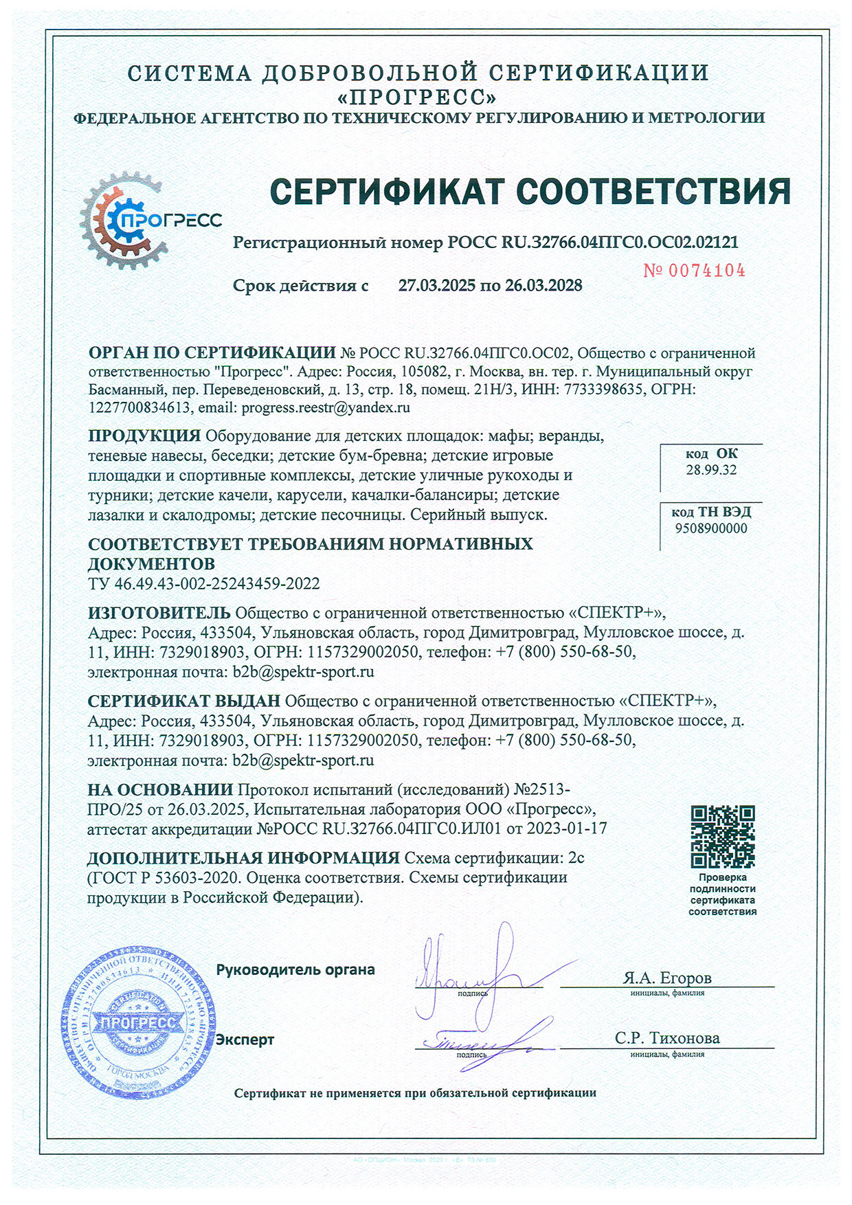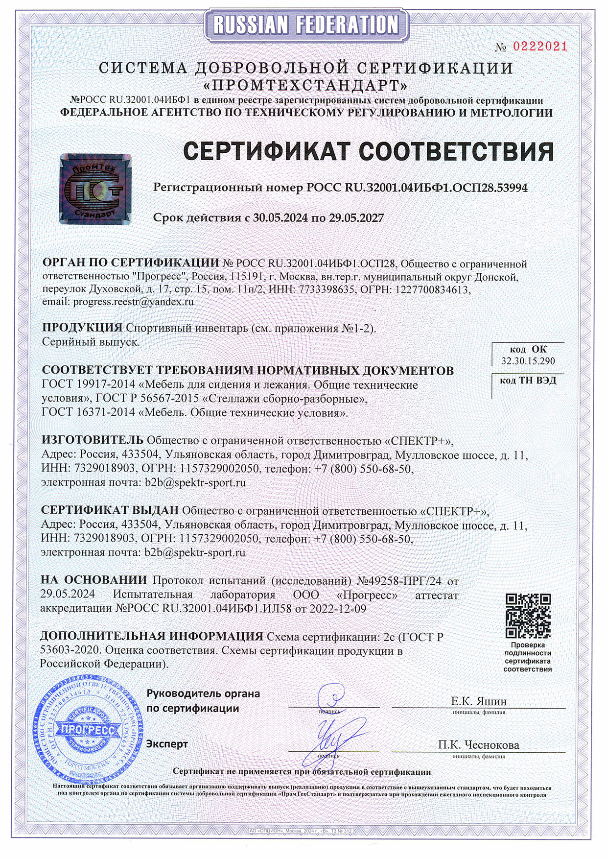 Сертификат соответствия (тренажёры, покрытия)
